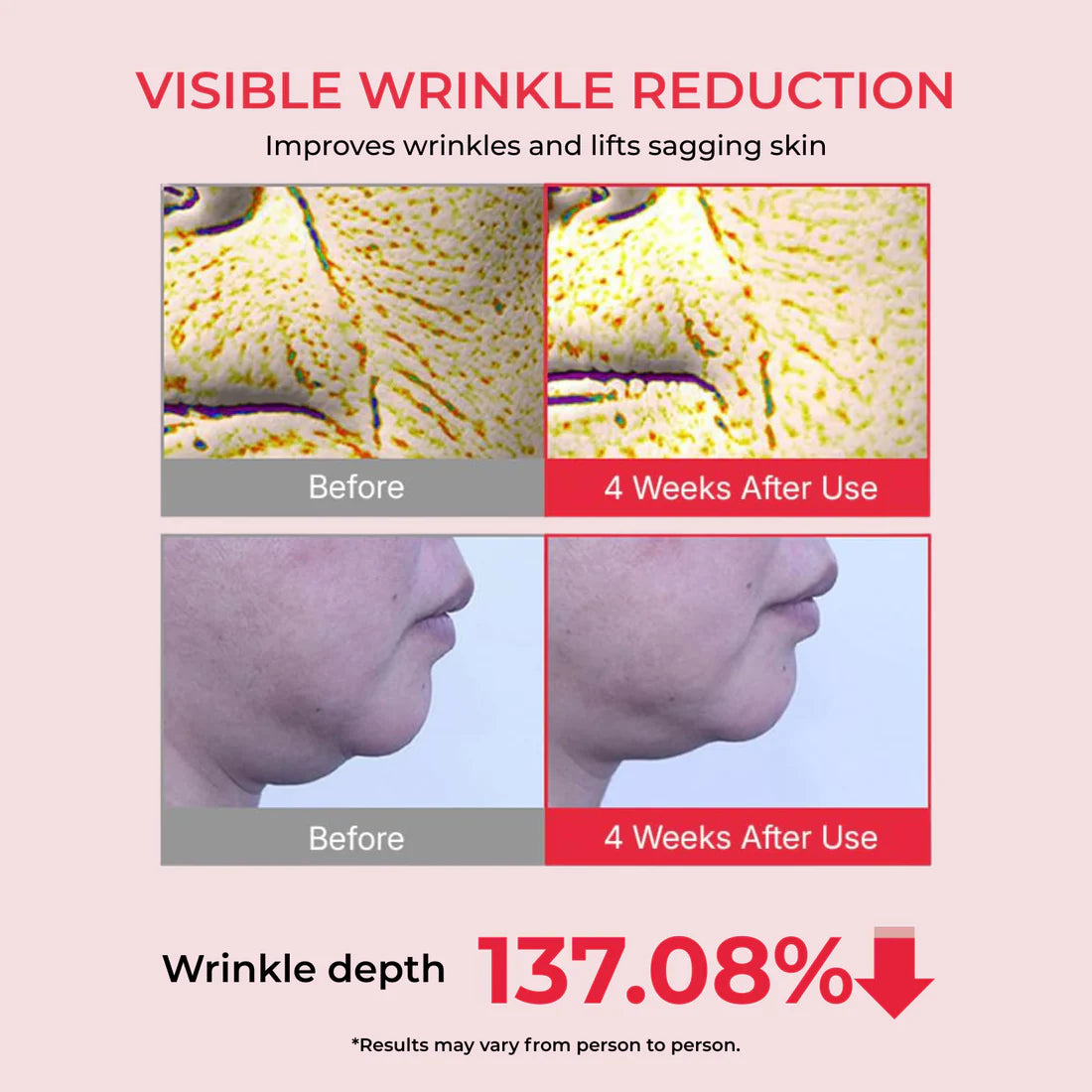 Studies show visible improvements in wrinkle count, size, and depth after consistent use.